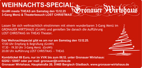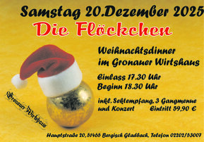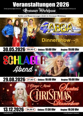 Während das Gronauer Wirtshaus an diesem Tag seine berühmte "Flammlachs"-Saison 2024 beendet, gibt es eine Show-Premiere: Julie Voyage, der mit seinem scharfen Humor, seiner echt kölschen Art und seinen Pointen knapp oberhalb der Gürtellinie agiert, und Jenny Budek, die mit ihrer herausragenden Stimme Hits aus verschiedenen Epochen darbietet, sind in dieser besonderen Kombination eine Musik- und Comedy-Show der Extraklasse. Im Preis von 49,90 € ist der Flammlachs-Abend enthalten. Karten gibt es im Gronauer Wirtshaus.